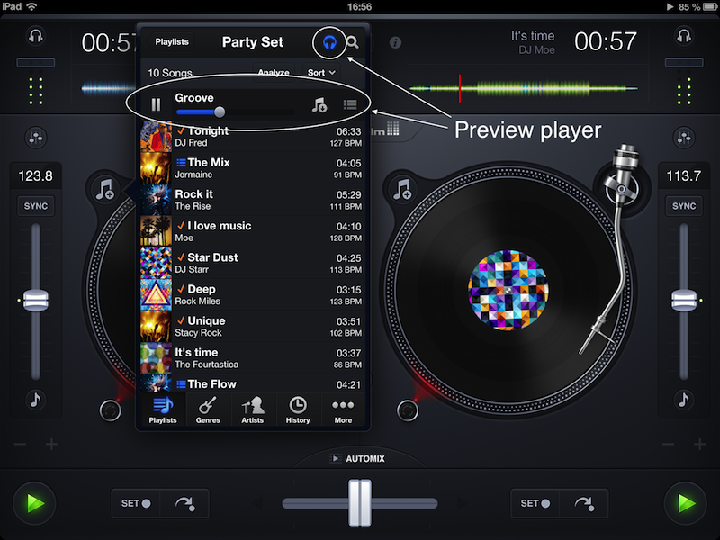 - Vista previa instantánea: Vista previa rápida de una pista en la biblioteca antes de cargarla en el deck