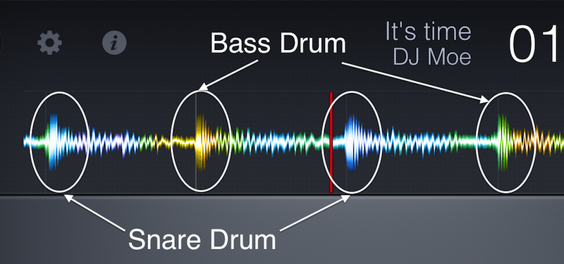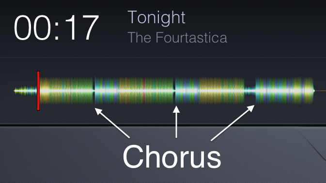 - Timeline espectral: En el modo de vista general, éste muestra la estructura de la canción (por ejemplo, el verso, chorus). El modo detalle permite al usuario distinguir bombos, snare, hi-hats,etc gracias al color