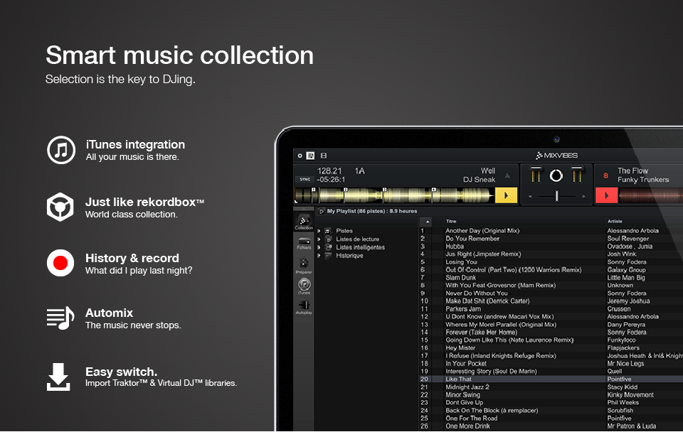 - Importa librería de Rekordbox, Traktor, Virtual DJ, incluyendo los beat grids y los hot cues.