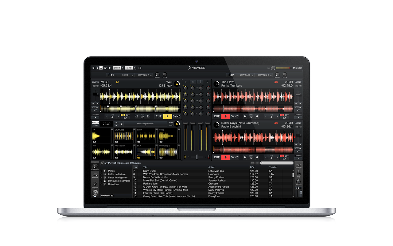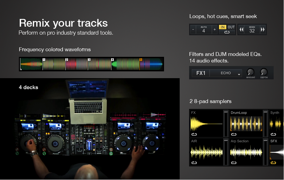 - Mixer de cuatro canales con EQ de 3 bandas, faders de volumen, crossfader, vúmetros y filtro «bipolar». Preset de EQ tipo Pioneer DJM disponible.