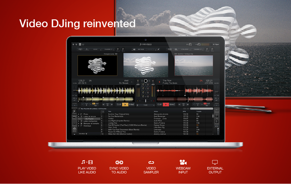 - Sincronización de vídeo: los vídeos con tempo establecido se sincronizan con la pista de audio. Visuales rítimicas para VJs pueden emplearse con cualquier canción.