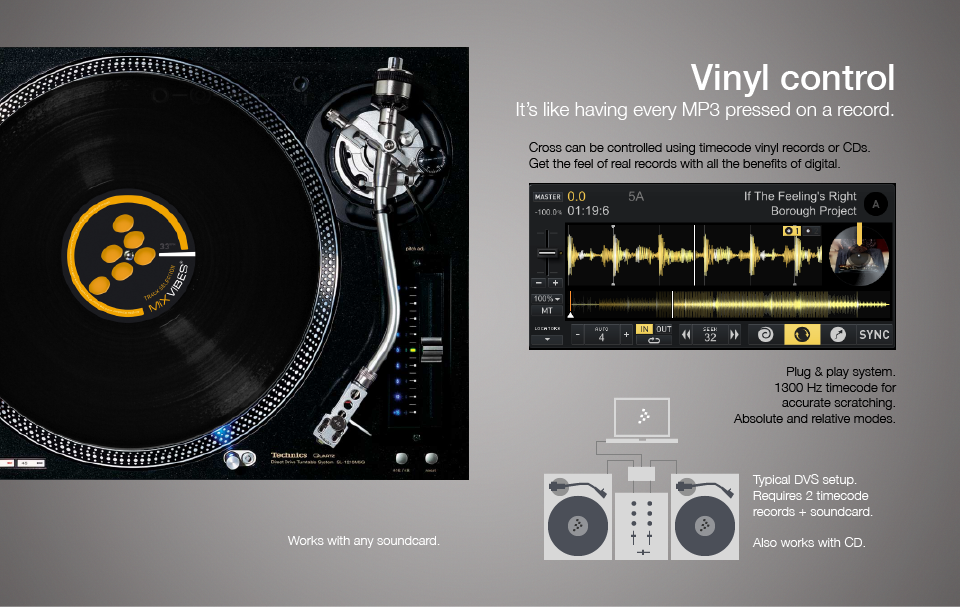 – Cross (109,99 € / $ 129,99): Esta es la versión más completa de la aplicación, tanto es así que hasta cambia de nombre. A parte de todo lo que hemos mencionado en este post tiene la tan ansiada compatibilidad tanto con vinilos con CDs timecode así como la posibilidad de controlar el programa mediante los CDJs de Pioneer ya que es compatible con el protocolo HID.