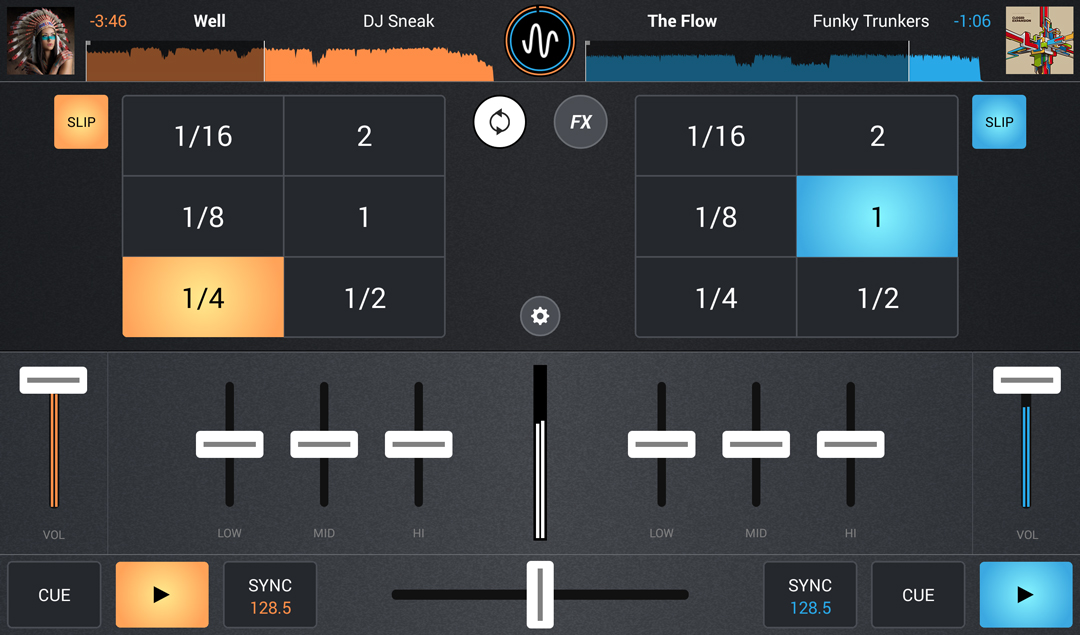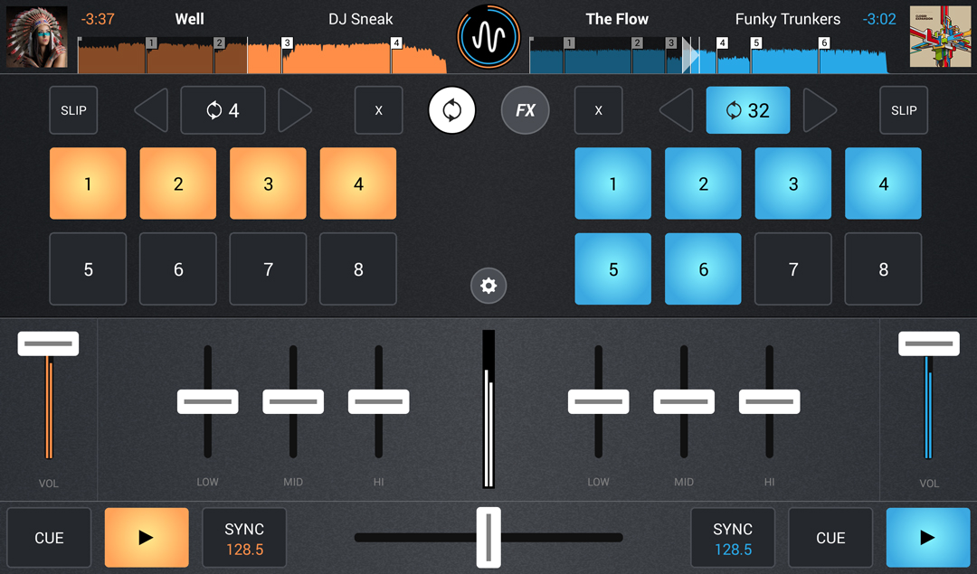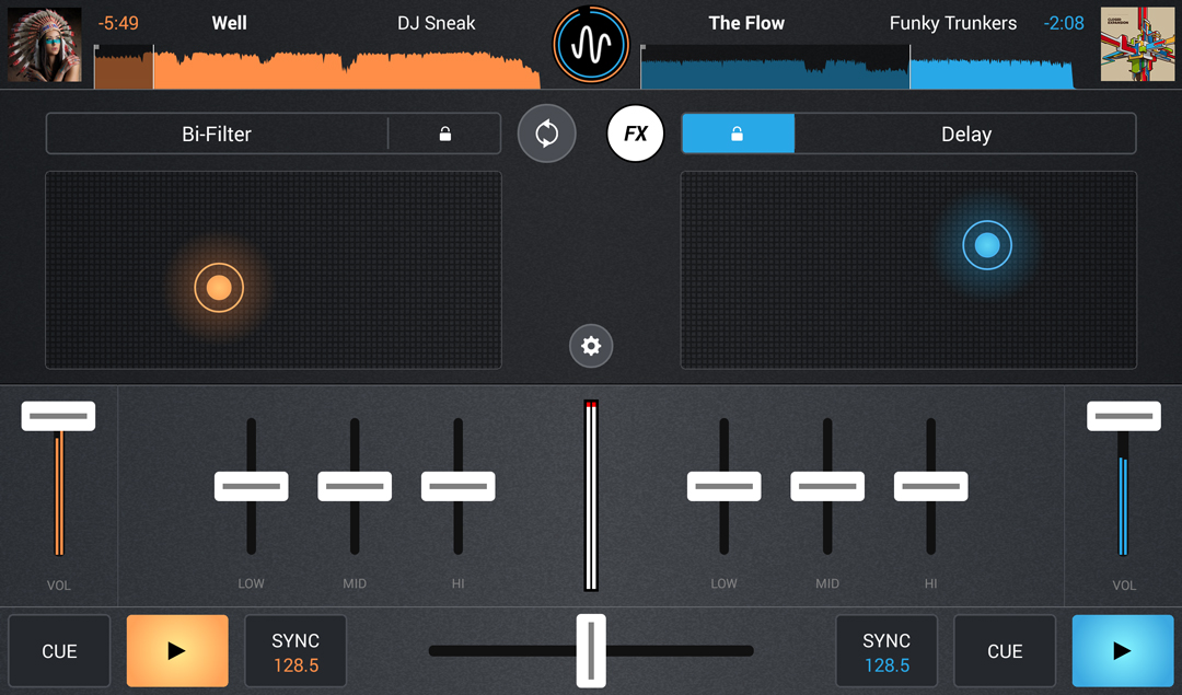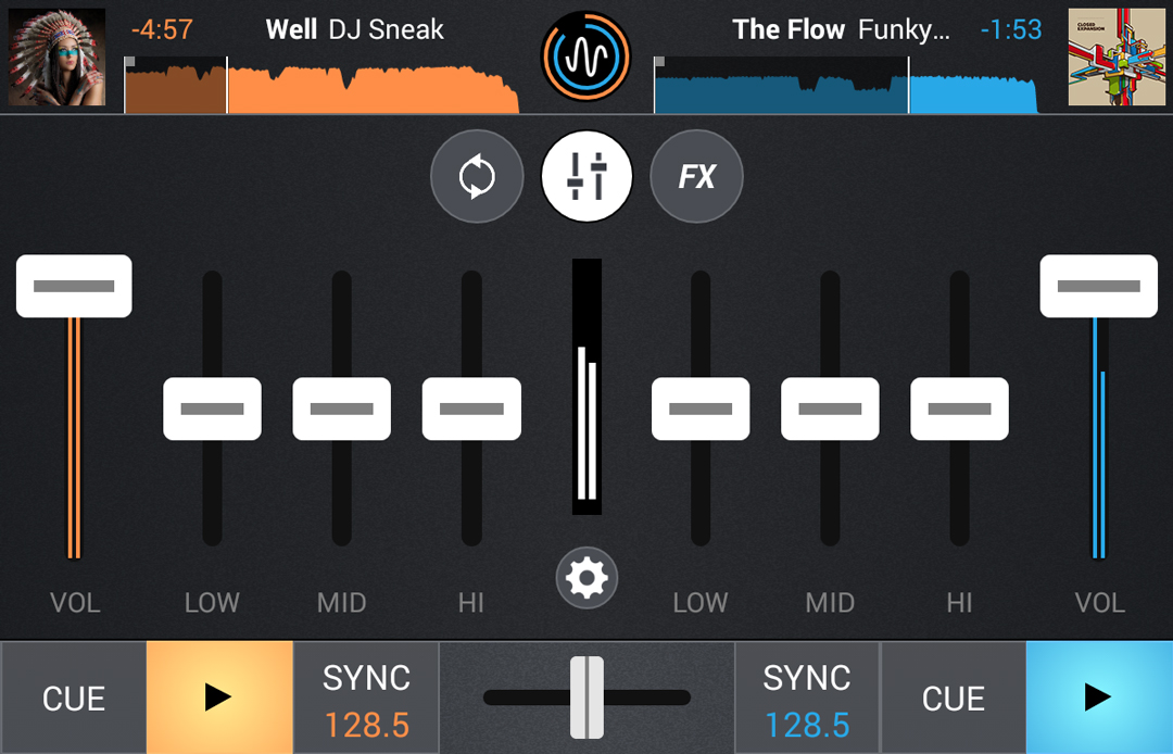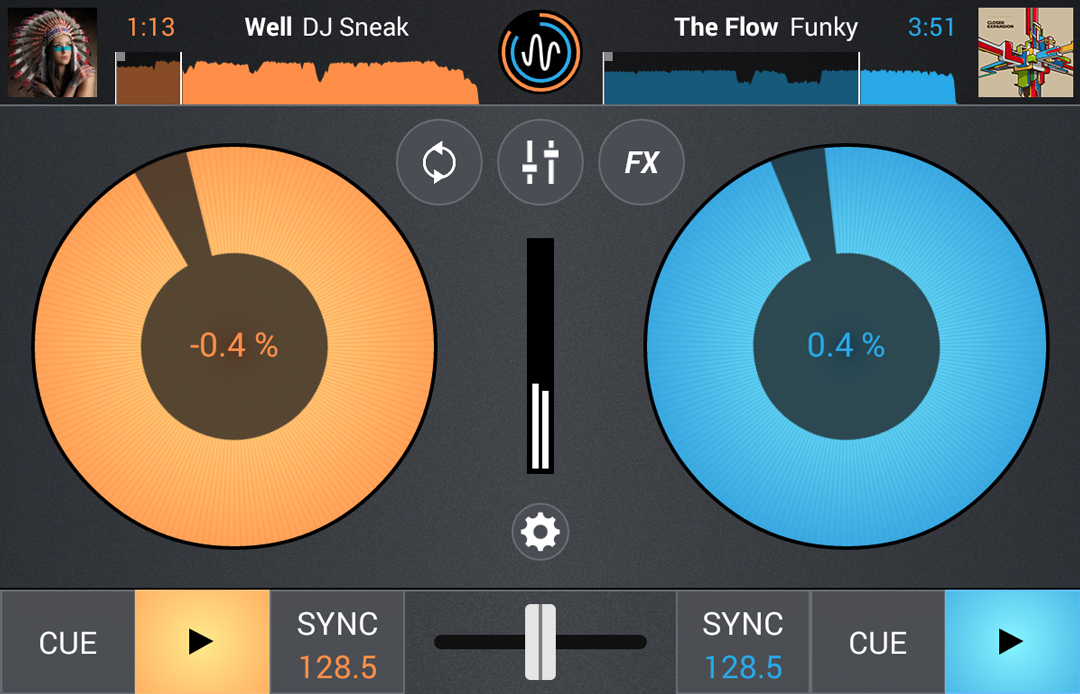Cross DJ detecta el BPM de las pistas de forma precisa y fiable debido a que hereda la misma tecnología usada en la versión de escritorio de la aplicación. Puedes guiarte viendo la forma de onda de la canción, para comprobar visualmente si se sincronizan tus pistas de forma correcta. También, si es necesario, es posible ajustar manualmente el pitch, así como editar el primer tiempo de la pista apretando sólo un botón.