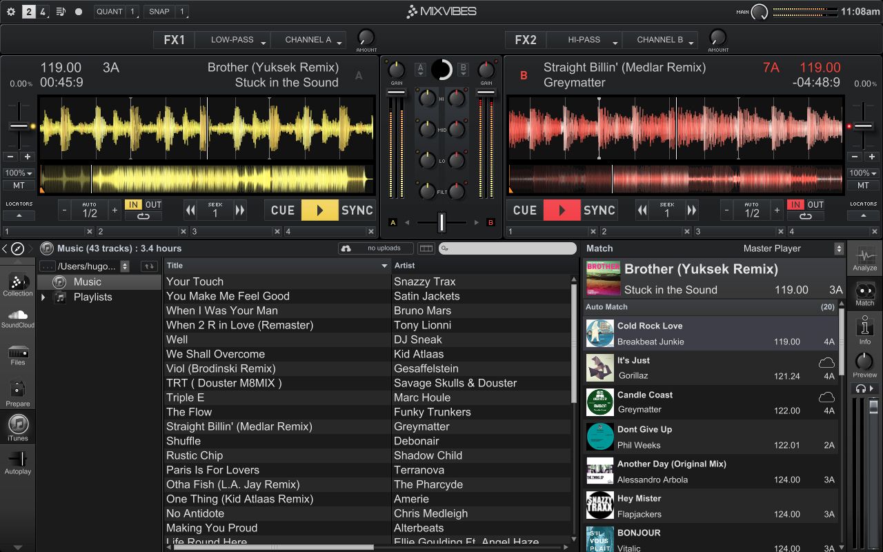 – Automatic Match: Muestra las mejores pistas para mezclar con la pista que se está reproduciendo. El algoritmo utiliza una combinación de BPM y Key.
