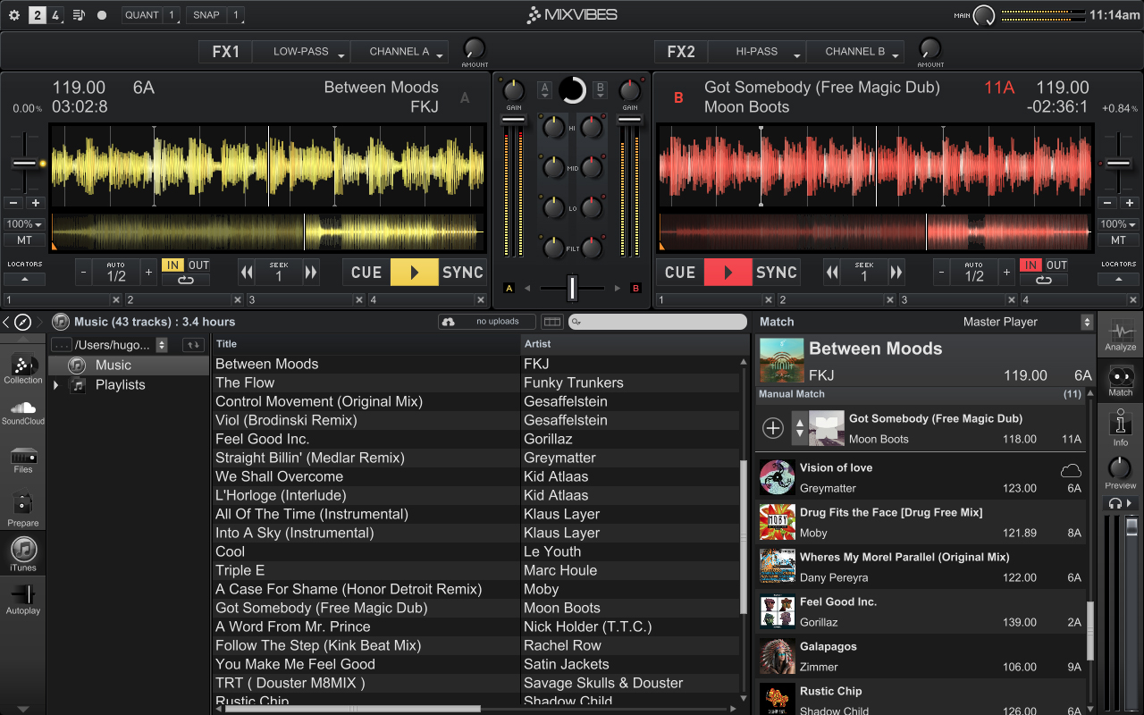– Manual Match: Si reproduces dos tracks que van bien juntos y deseas recordar esta combinación, haz click en el botón Match The Tracks para «emparejar las pistas». Estas combinaciones se mantienen en la memoria y se muestran cada vez que reproduzcas una de esas pistas.