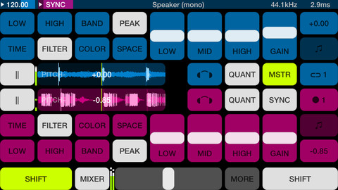 - 5 efectos simultáneos por deck: time (roll), filter, color (flanger/lofi), space (echo/reverb) y low/highpass