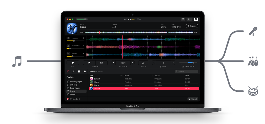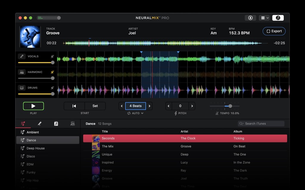 Neural Mix Pro es un reproductor y editor de música provisto de inteligencia artificial que está dirigido tanto a productores como a DJ y músicos. Creado por el desarrollador germano Algoriddim, Neural Mix Pro proporciona una interfaz intuitiva para aislar los ritmos, los instrumentos y las voces de cualquier canción.
