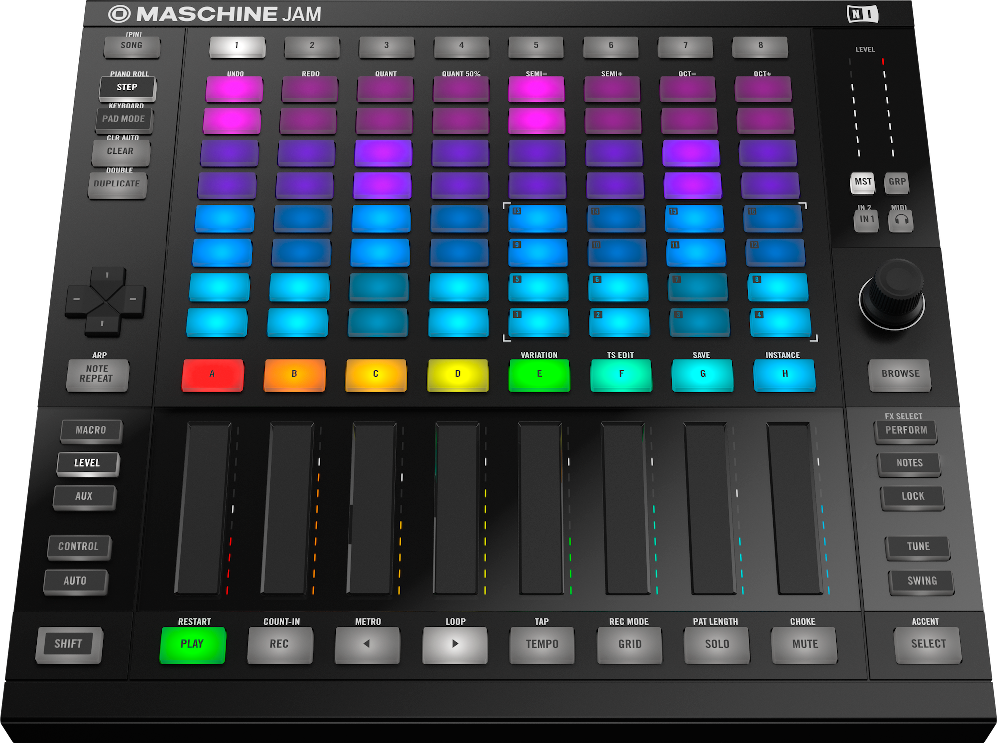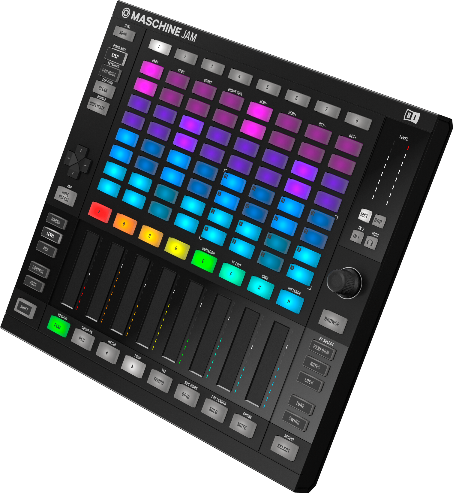 Maschine Jam ofrece un conjunto único de características en cuanto al hardware que refuerza el proceso creativo. Su flujo de trabajo se centra en una matriz de 8×8 pads multicolor donde los productores y los artistas pueden experimentar con las posibilidades de disposición que utilizan los patrones y las escenas. En el Step Mode, la matriz se convierte en un poderoso secuenciador multipista por pasos para uno, cuatro, ocho o más sonidos simultáneamente. En el Pad Mode, se introducen sonidos en tiempo real, mientras que el modo Piano Roll las melodías están disponibles en una amplia variedad de escalas. Cuando se activa el Variation Engine, los ritmos y melodías de inspiración son generados al azar sobre la base de los valores personalizables y luego modificados en la matriz. Un humanizer incorporado añade fluctuaciones rítmicas naturales a las secuencias programadas.
