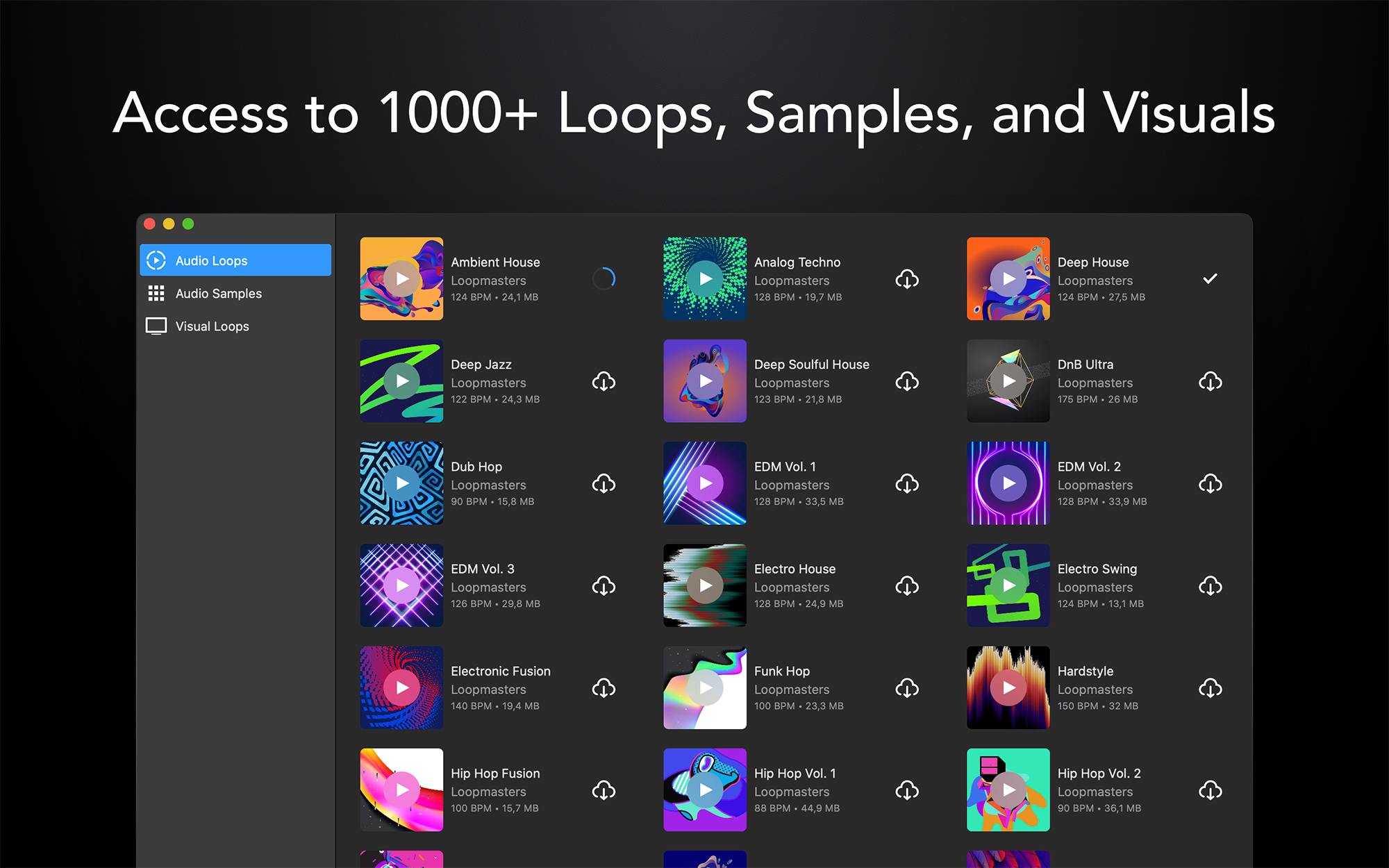 - Acceso ilimitado a una amplia biblioteca de samplers, loops, efectos de audio y efectos visuales