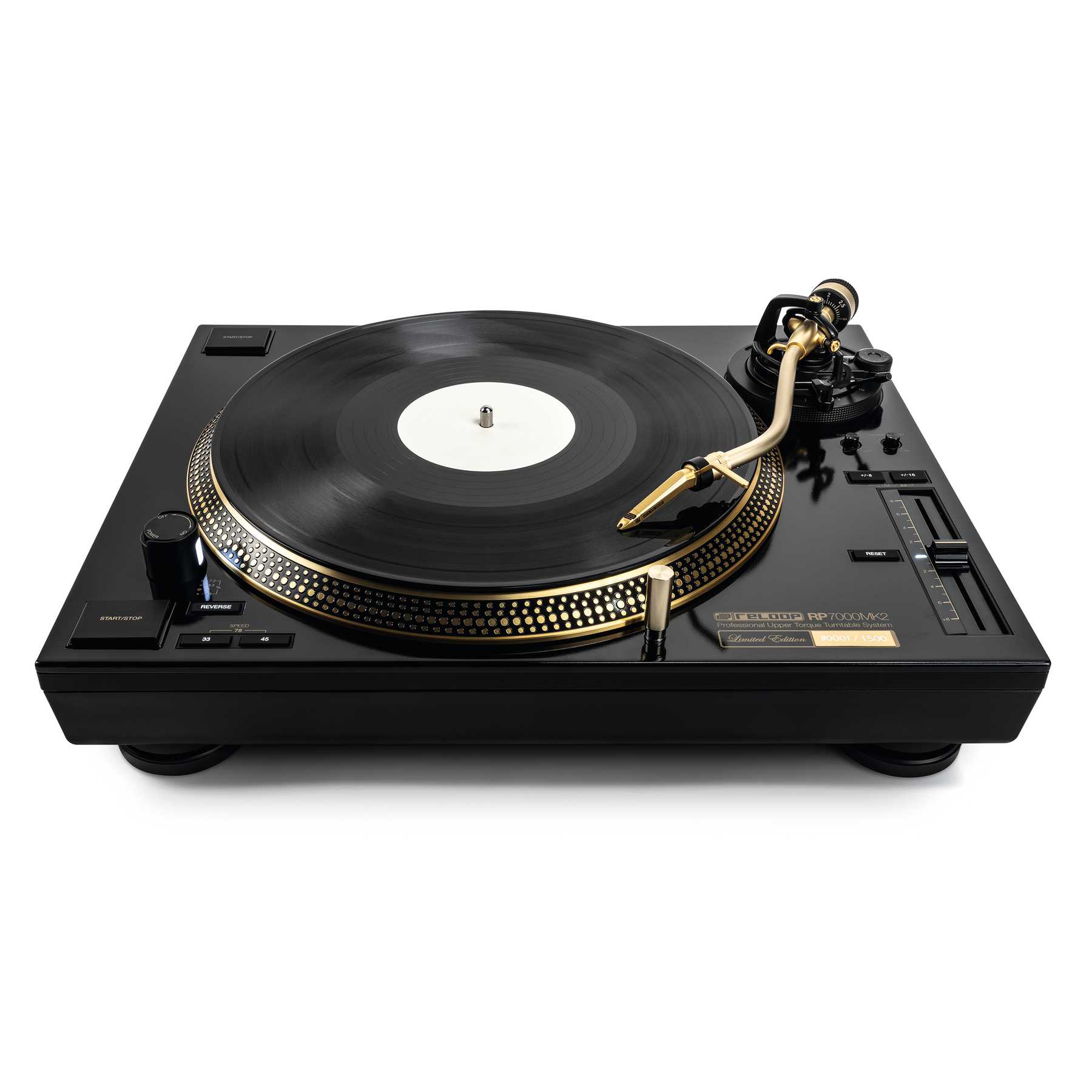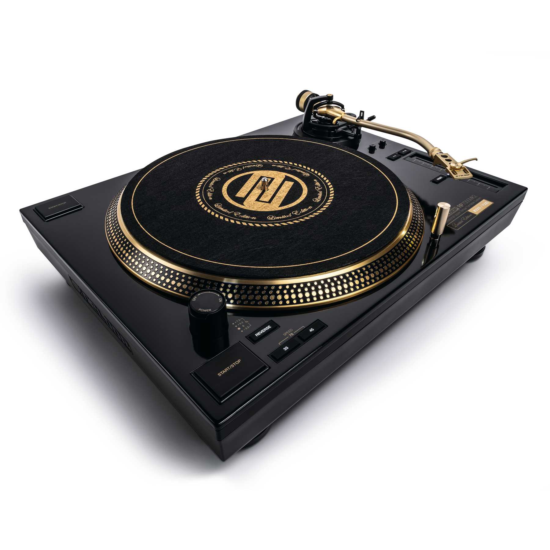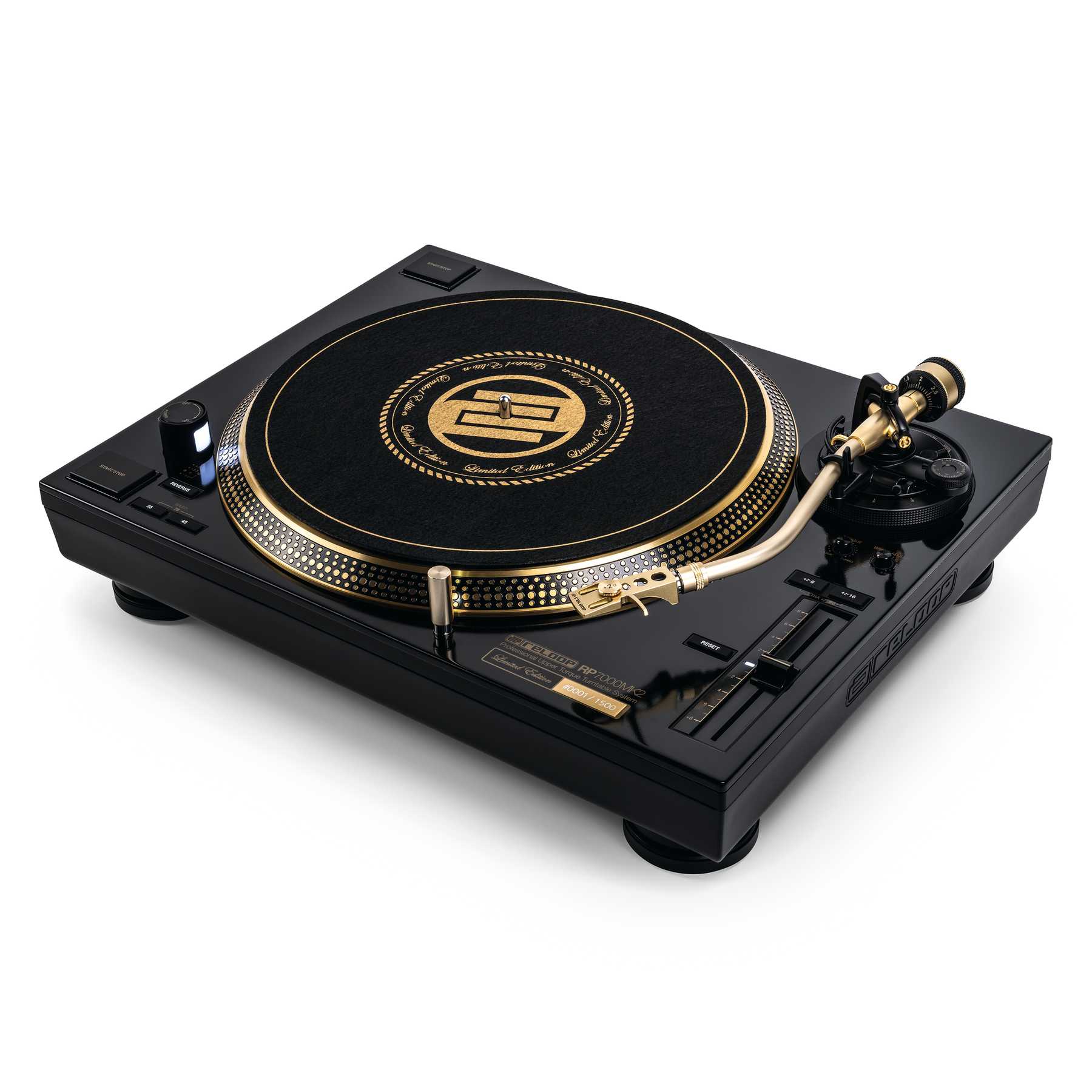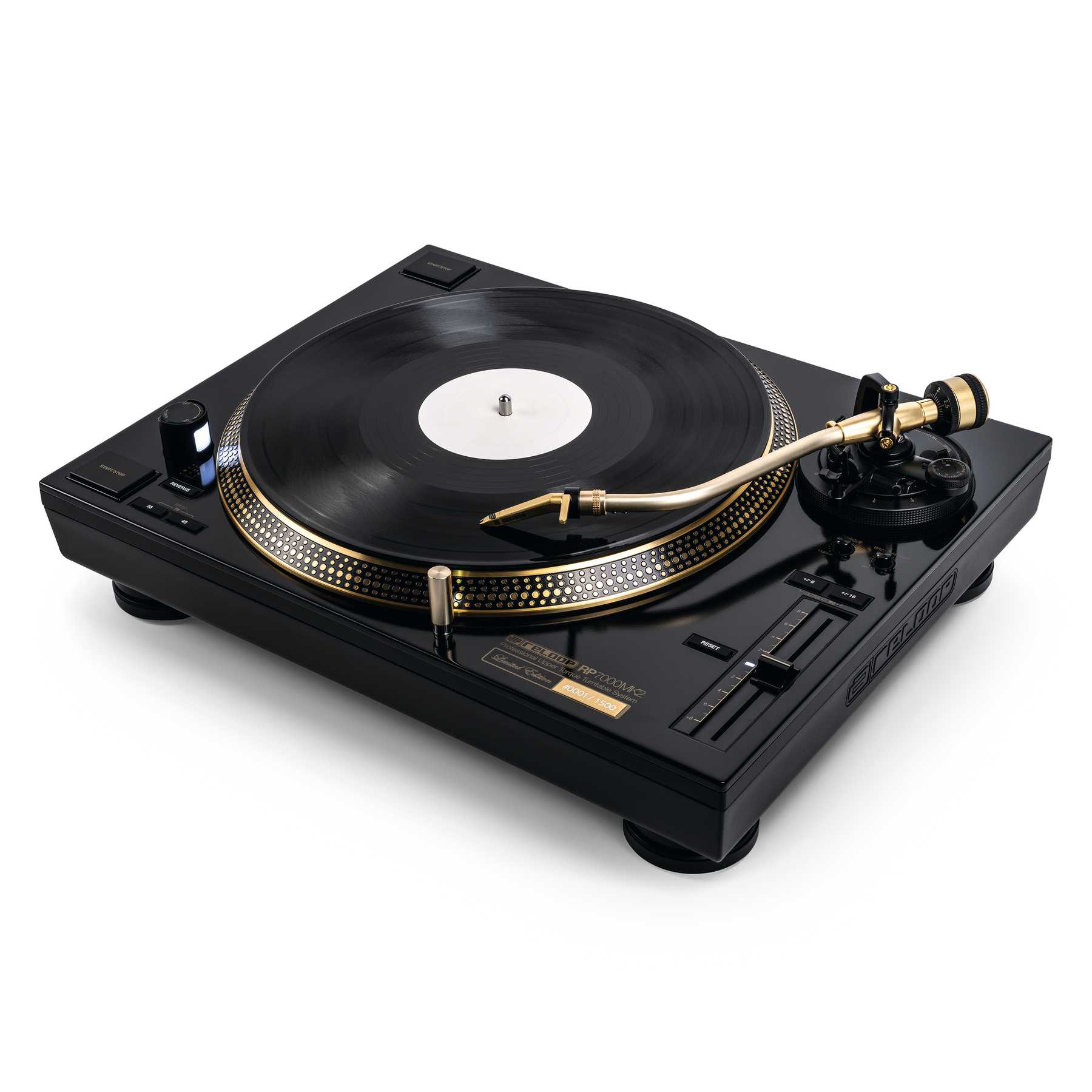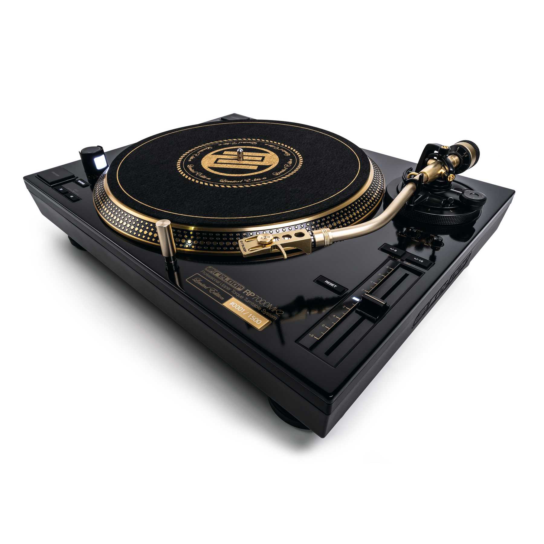 Reloop RP-7000 MK2 GLD es la edición limitada del Reloop RP-7000 MK2 en color dorado y negro del cual el fabricante germán solo ha comercializado 1500 unidades. Además de una placa con el número de la unidad, esta edición incluye una bandeja en color dorado y un exclusivo slipmat diseñado por Reloop.