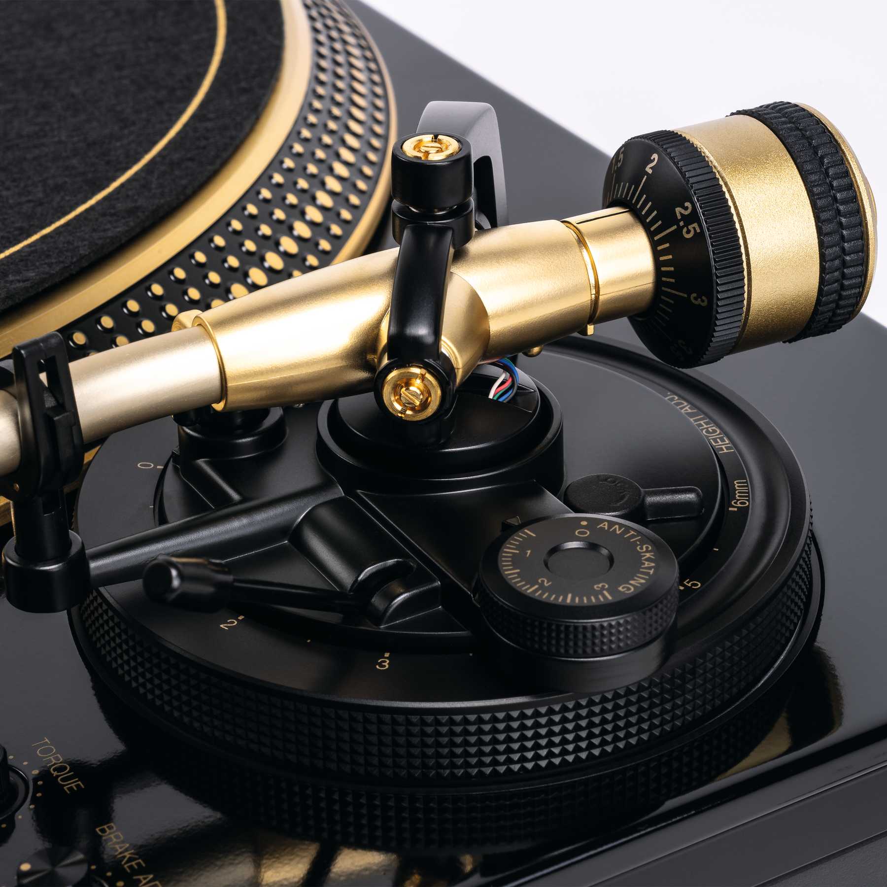El Reloop RP-7000 MK2 GLD cuenta con un brazo en forma de S, equilibrado estáticamente, con elevación hidráulica y mecanismo anti-skating. La base del brazo recientemente desarrollada, proporciona estabilidad mejorada y viene con ángulo de seguimiento vertical (VTA). El brazo de baja resonancia viene con una conexión universal para conectar portacápsulas de cualquier tipo (SME).