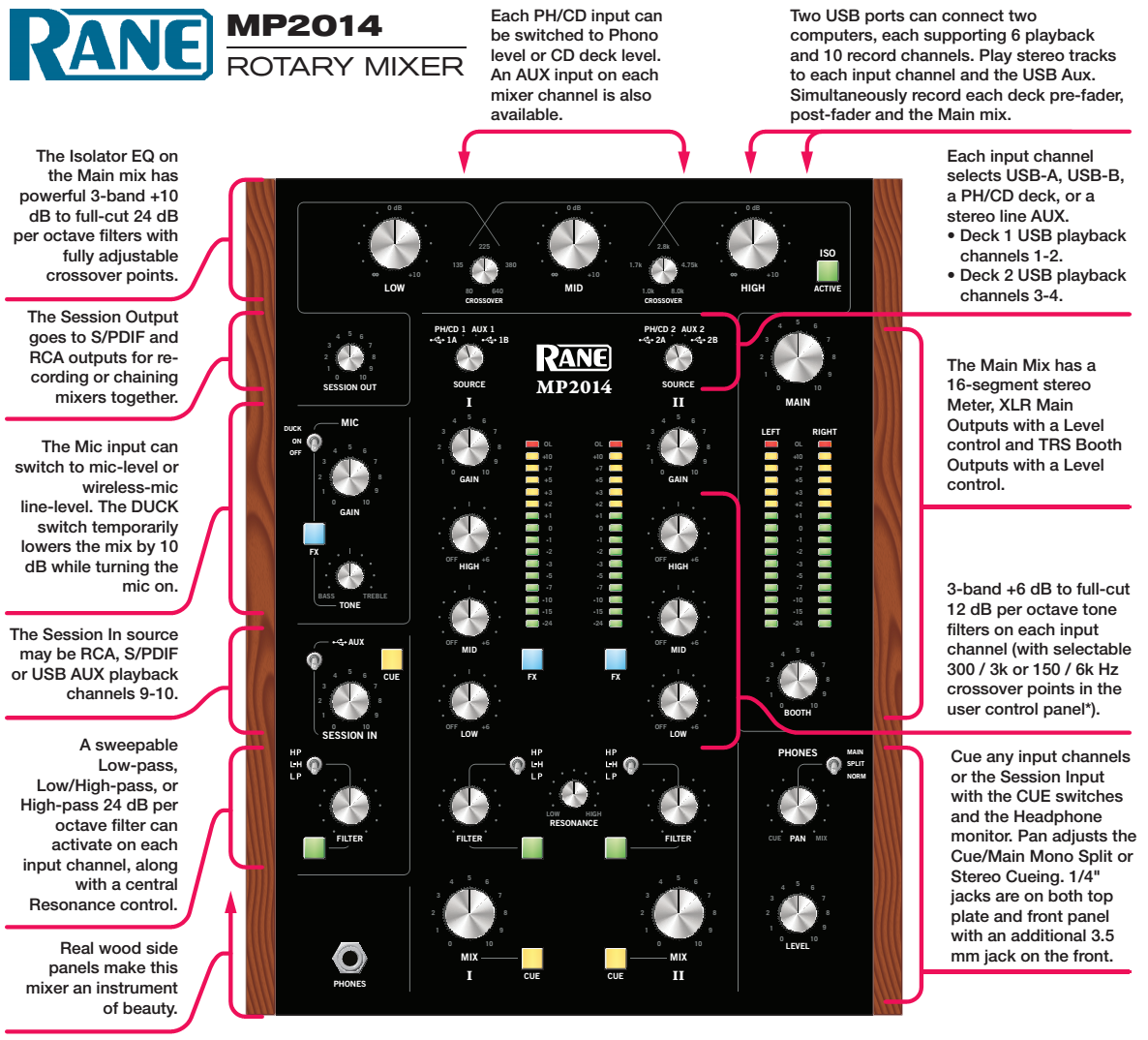 El Rane MP2014 está diseñado únicamente para el artista que busca la fluidez y las transiciones suaves que proporcionan los knobs rotatorios que por definición son tan suaves como la seda. Al igual que su hermano mayor de cuatro canales, este mixer se caracteriza por la combinación de características poderosas y únicas, su elegancia clásica, su diseño robusto y una simplicidad muy intuitiva.