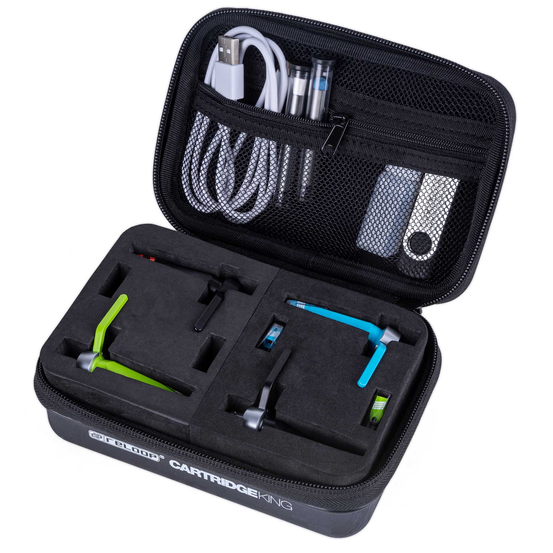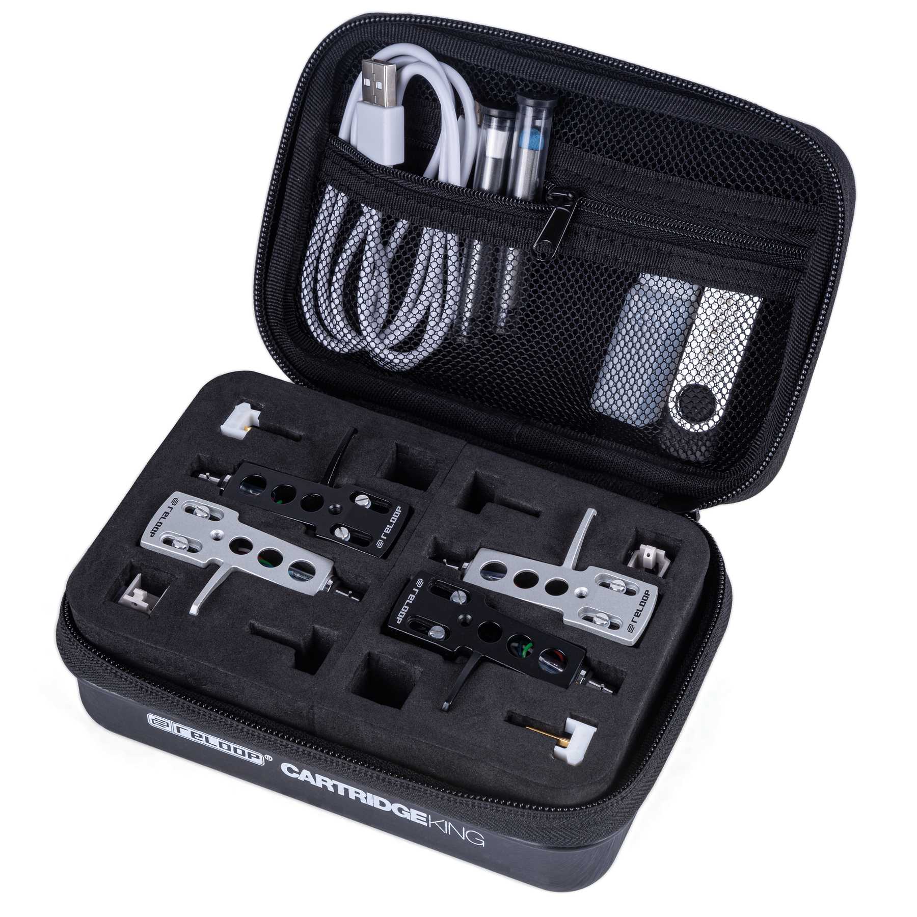 Cartridge King es un estuche de almacenamiento altamente transportable diseñado para guardar de forma segura hasta cuatro agujas y sus respectivos repuestos, dos de tipo Concorde y otras dos de tipo cabezal (headshell), con lo cual puedes colocar agujas de fabricantes tan conocidos como Ortofon, Shure o Reloop.