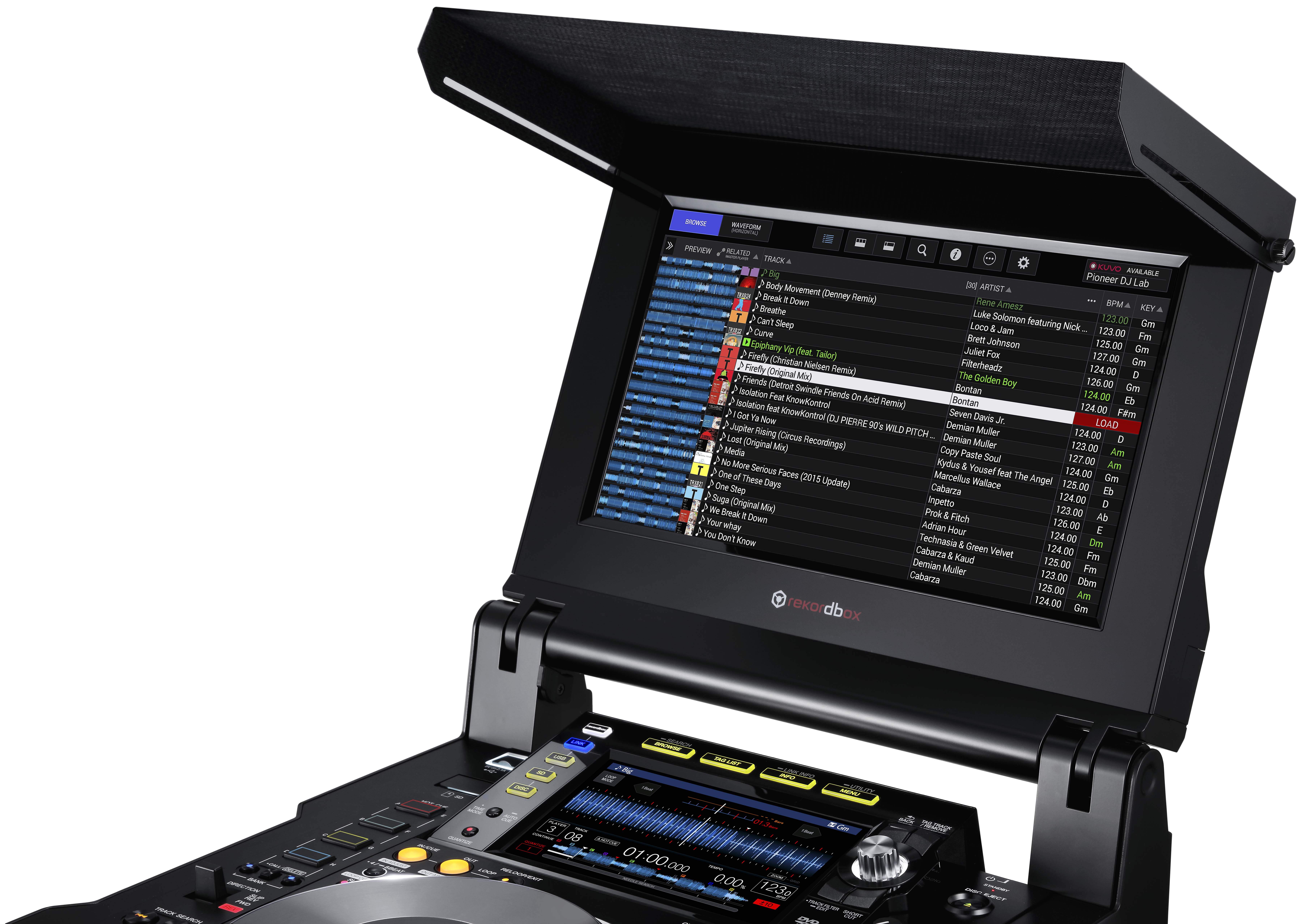 Utiliza el estándar integrado de 7 pulgadas o la pantalla táctil a todo color, plegable, LCD de 13 pulgadas. La pantalla más grande muestra más información para ayudar a buscar y seleccionar pistas más rápidamente. Además, con su propia CPU incorporada, la pantalla ofrece la posibilidad de otras características futuras. Ambas pantallas disponen de la misma información que el CDJ-2000NXS2, incluyendo: