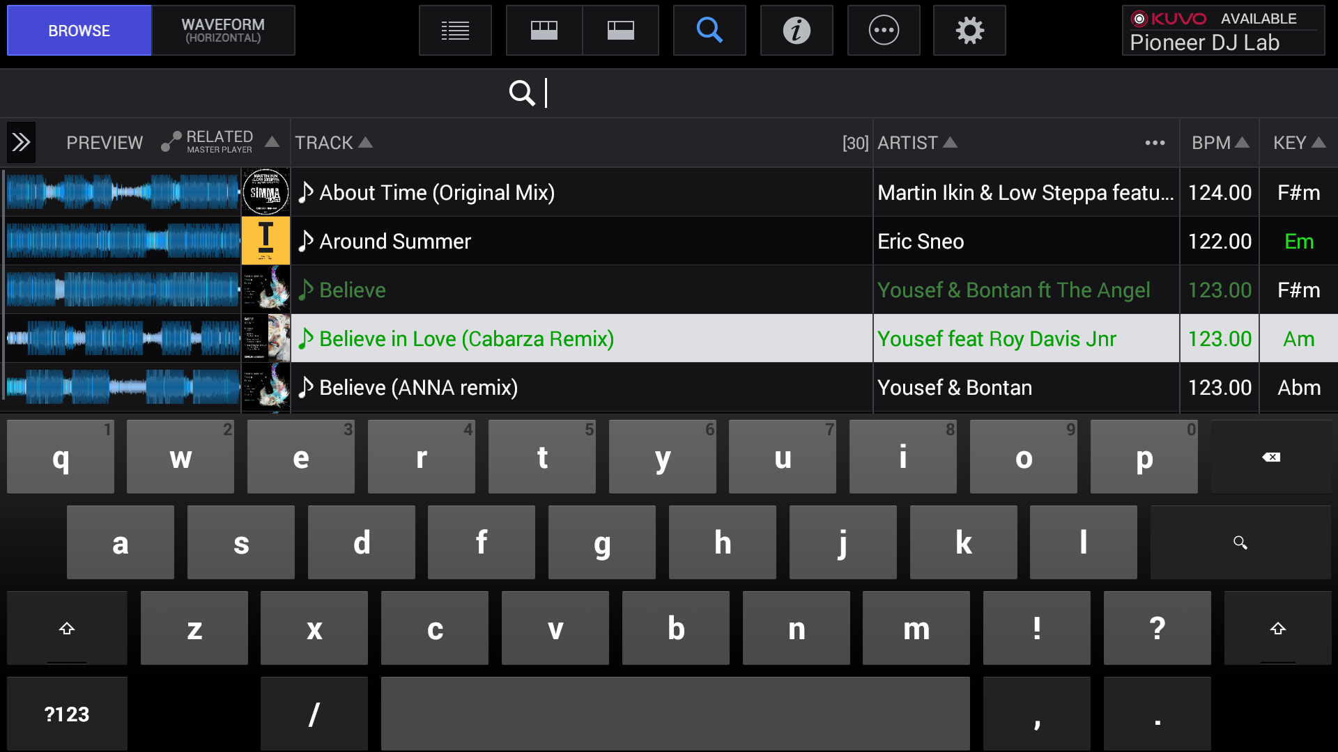 - Búsqueda por palabras clave: mostrar el teclado QWERTY para buscar pistas por su nombre.