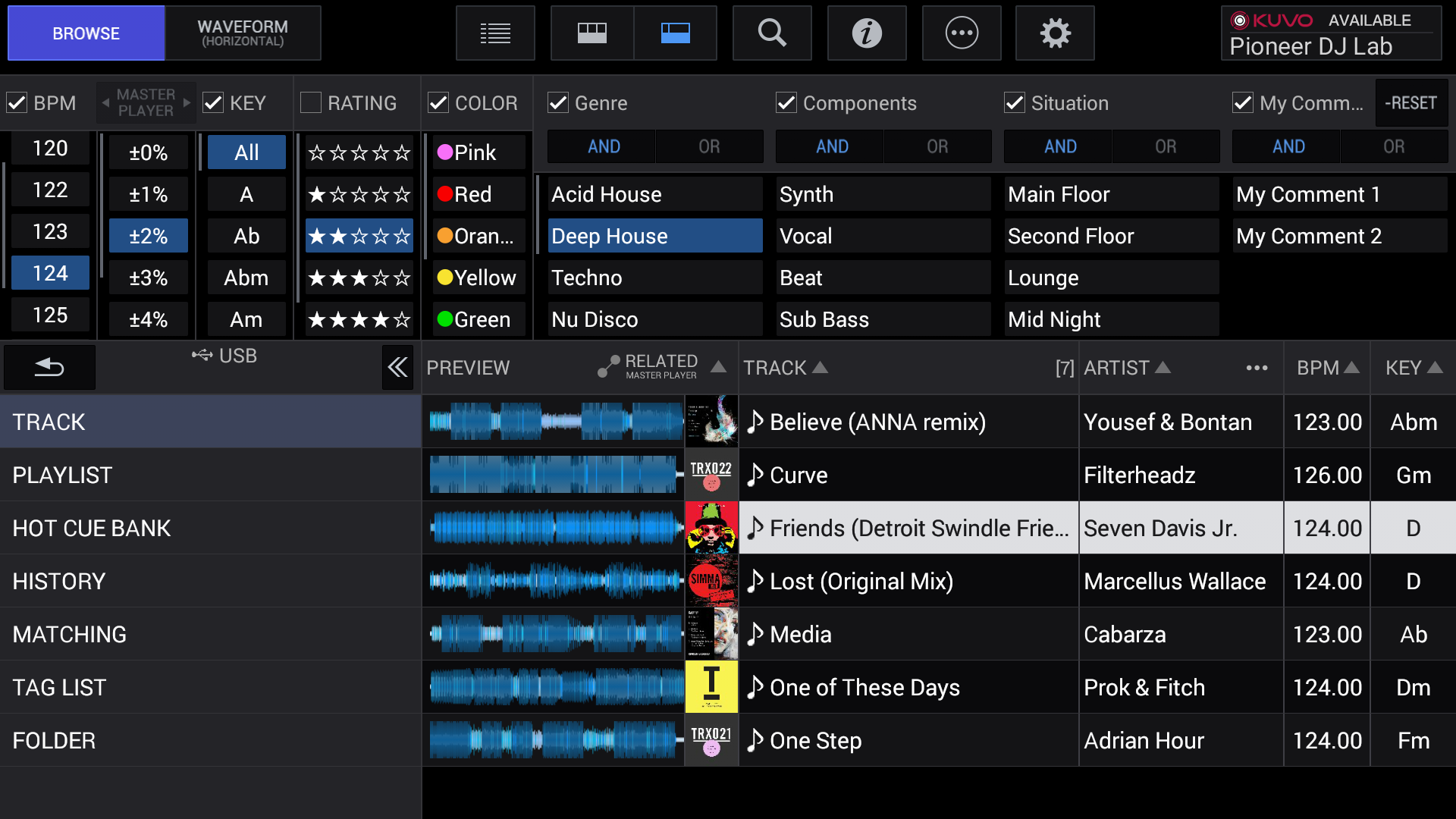 - Modo de filtro de temas: usa la pantalla táctil para filtrar las pistas de información Rekordbox tales como BPM, clave o Mis etiquetas.