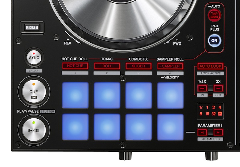 El DDJ-SR añade un elemento de diversión y un gran rendimiento gracias a características tales como los pads LED de alta calidad, que permiten a los DJs activar Hot Cue, Slice, Roll y Sampler Mode, además de controlar el volumen de cada sampler dependiendo de la presión que se ejerza sobre dichos pads.