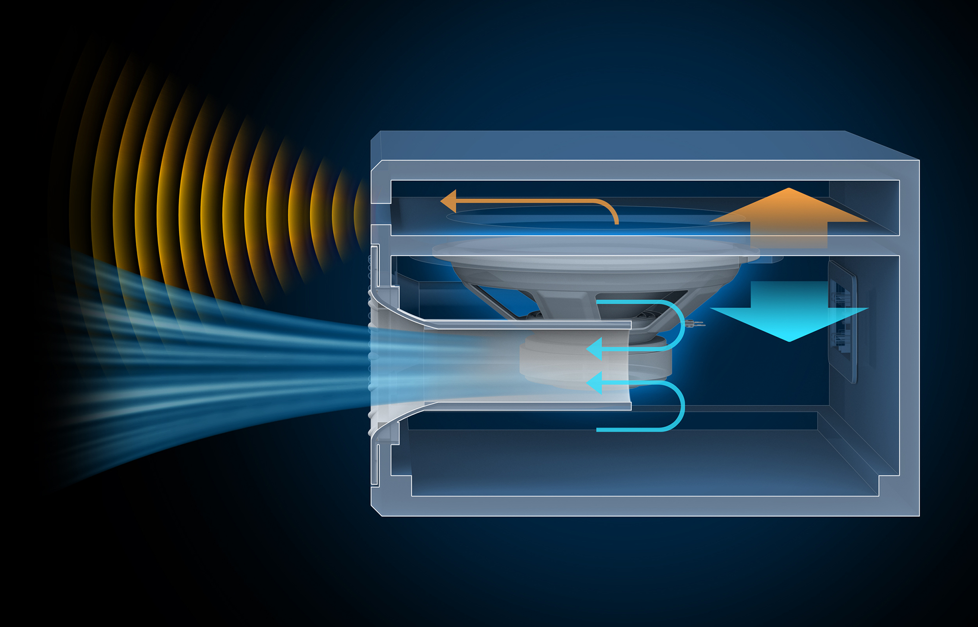 Descubre unos graves cálidos con el nuevo Vortex Bass Accelerator. El puerto bass-reflex se ha construido con ranuras para garantizar que el aire fluya sin distorsión, para maximizar las bajas frecuencias y eliminar cualquier vibración no deseada.