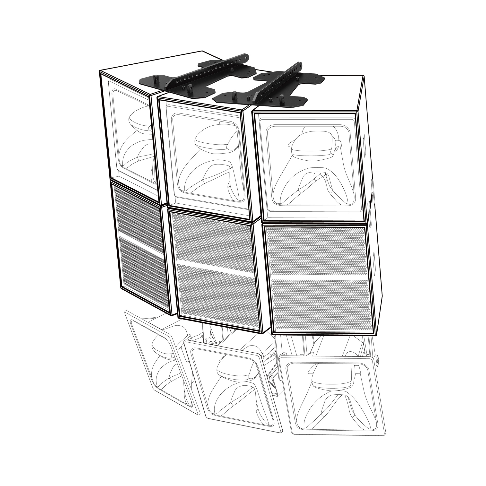 Los modelos XY-1 y XY-2E se pueden implementar rápida y fácilmente en diferentes escenarios de instalación fija y escenarios móviles, lo que permite numerosas configuraciones sobre la marcha y el apilamiento en el suelo. Implementar las unidades individuales en techos bajos o hacer arreglos horizontales usando la base volante CP-XY1VC1 o la placa de unión CP-XY1DF1 respectivamente. O crea una matriz de hasta nueve altavoces (3×3), utilizando una combinación de placas CP-XY1DF1 y placas CP-XY1CON1. De forma adicional, integra el XY-2 debajo de los XY-1 y XY-2E para una mayor cobertura MHF.