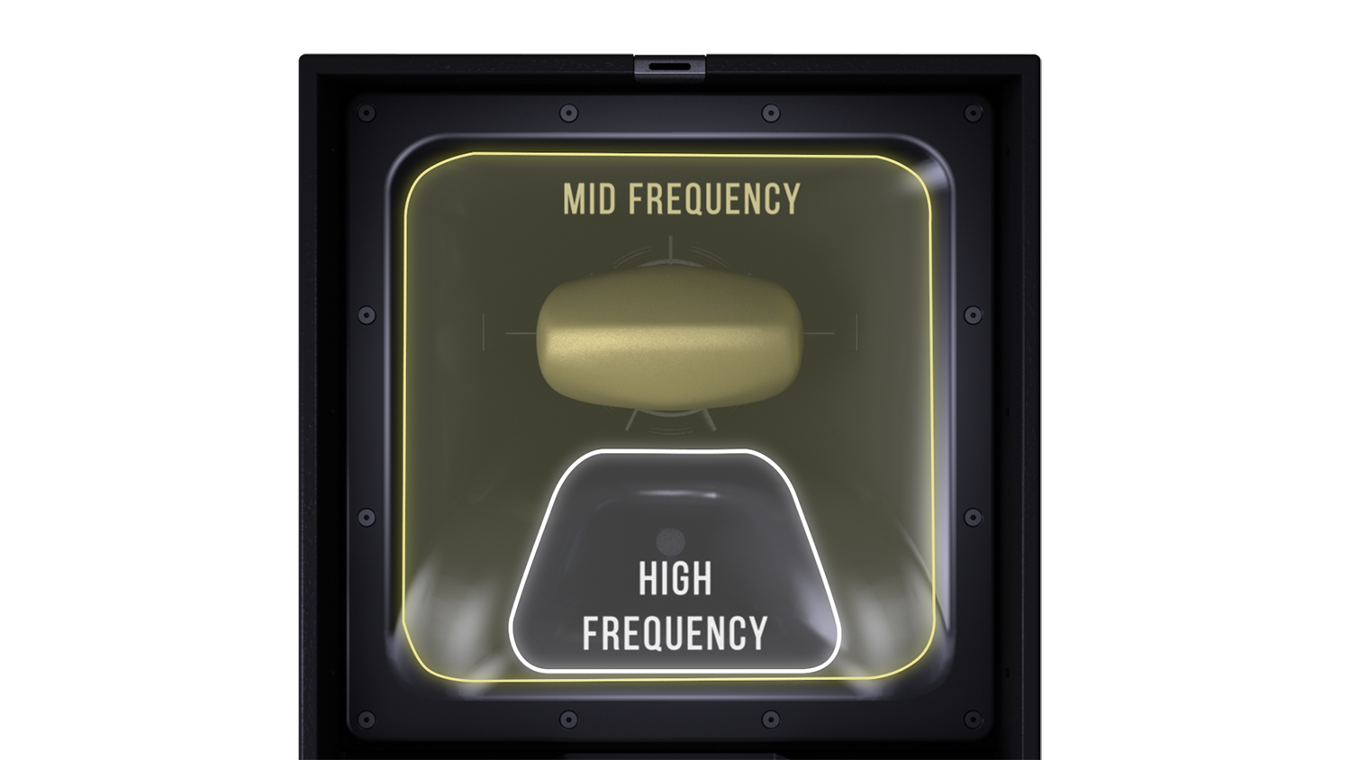 El altavoz de 8 pulgadas y el altavoz de compresión de 1 pulgada se sitúan a la guía de ondas integrada con sus localizaciones perfectamente alineadas para minimizar la diferencia de distancia física y reducir la cancelación de la frecuencia de cruce. Este diseño único de doble bocina combina las frecuencias medias y altas en una posición más profunda dentro de la guía de ondas, mejorando la mezcla de los sonidos en comparación con el rendimiento de una estructura de bocina convencional. La forma curvada de la guía de ondas controla perfectamente la dispersión a 50 grados en horizontal y 35 grados en vertical, proporcionando un sonido natural con un alto SPL en el área a la que se quiere dirigir el sonido, mientras reduce la presión acústica fuera de esa zona.
