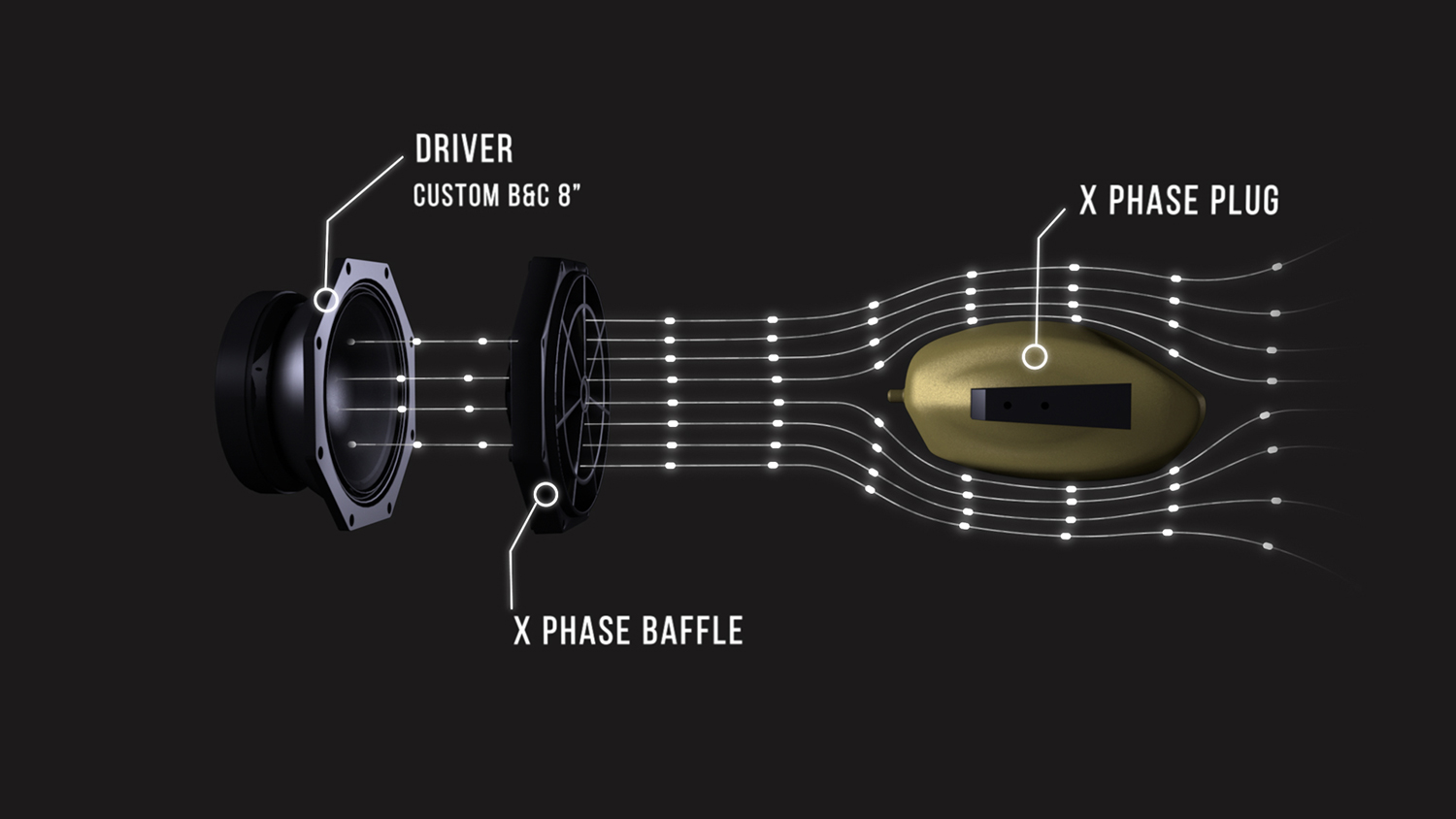 El cortocircuito acústico o cancelación sonora del altavoz se minimiza gracias al sistema X-Phase de Pioneer Pro Audio. La forma convexa fuerza el sonido a través de unas ranuras diminutas, dispuestas en forma de ventilador, permitiendo que todas las ondas sonoras salgan perfectamente en fase. Las ondas sonoras son forzadas por la parte superior e inferior del conector X-Phase, produciendo un mayor SPL y una mayor proyección del sonido a largas distancias.