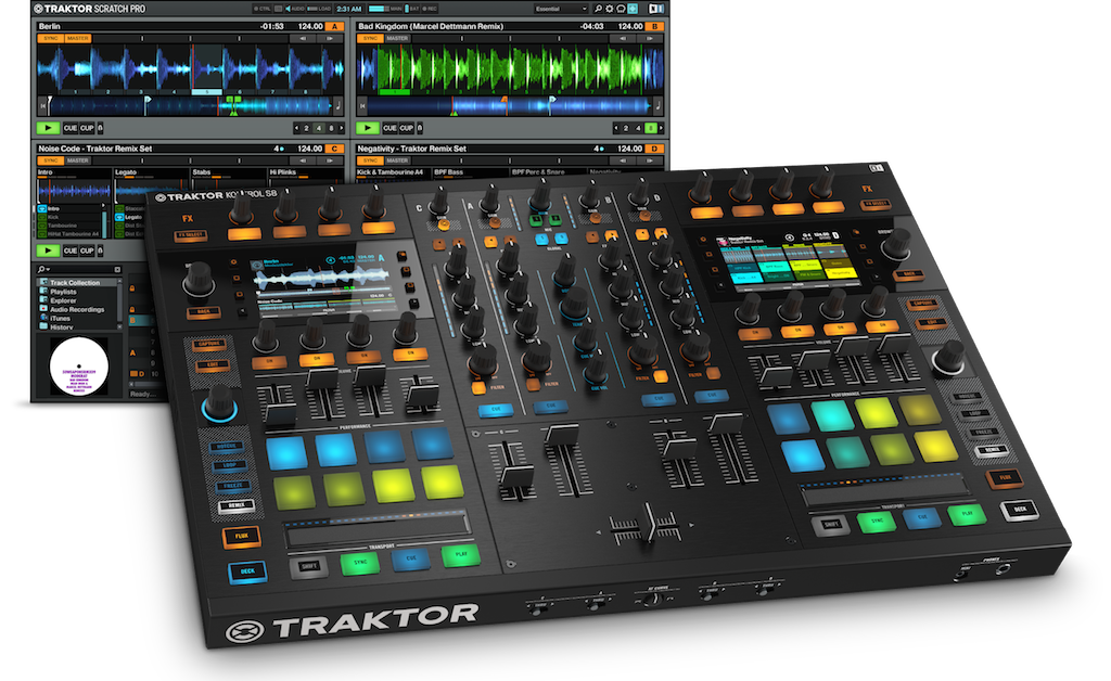 Traktor Kontrol S8 posee dos pantallas a todo color y sus controles son sensibles al tacto. Además cuenta con un mixer independiente de 4 canales y viene con Traktor Scratch Pro.