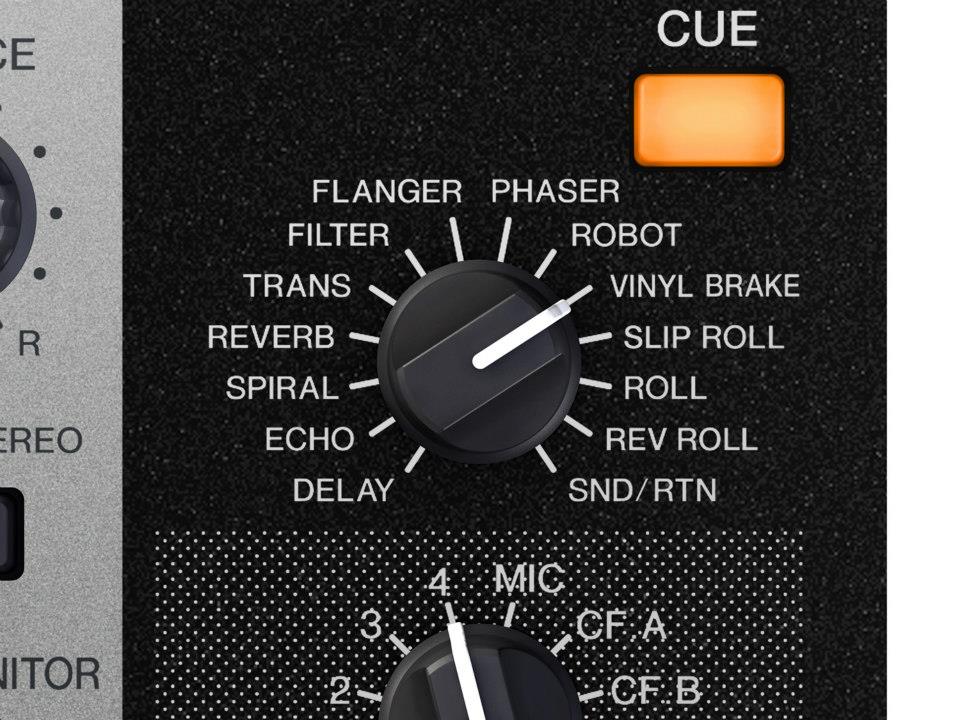 El mezclador cuenta con 13 Beat FX, incluyendo el nuevo Vinyl Brake, con un knob táctil para aplicar dry/wet a todos los efectos.