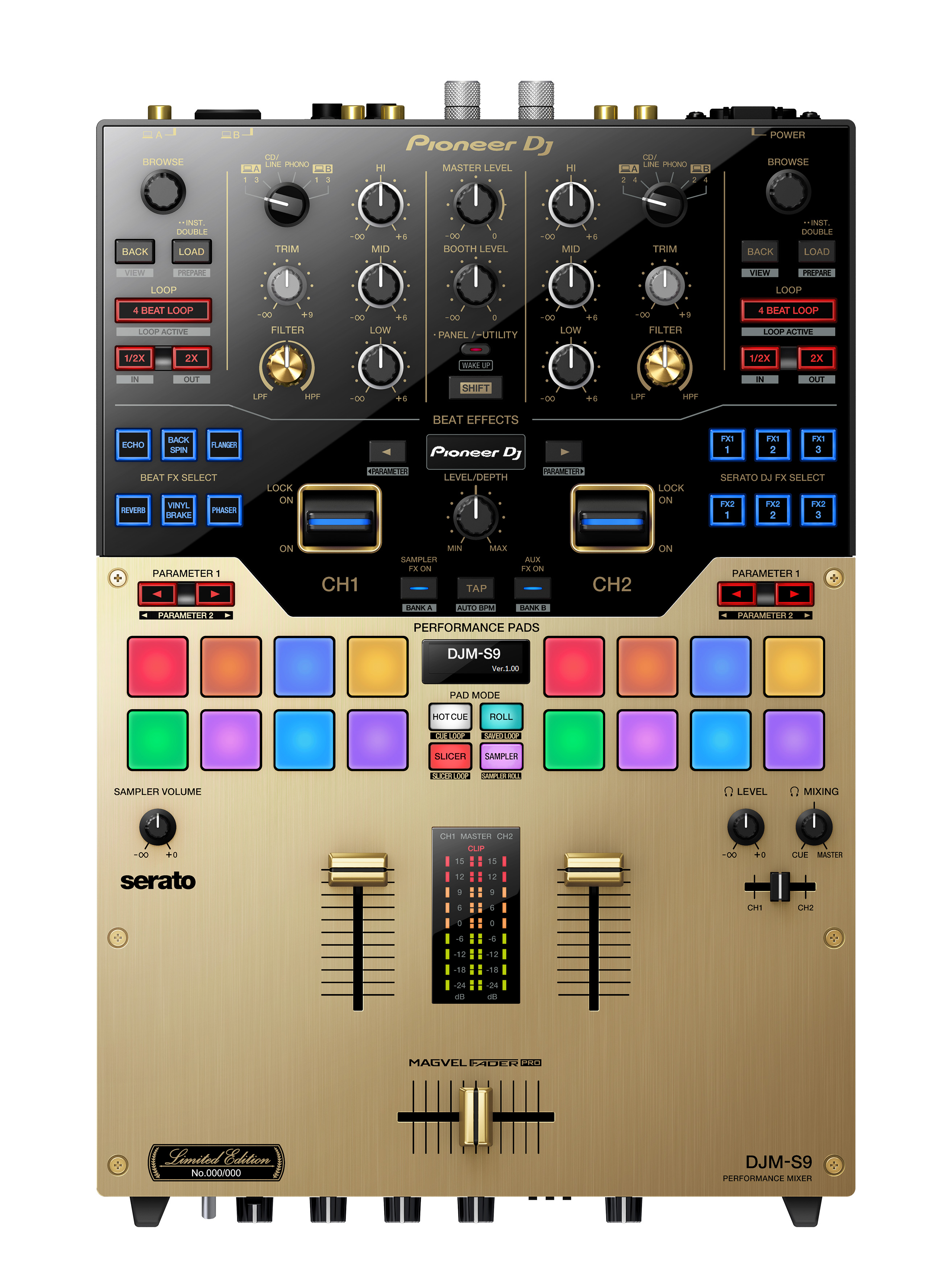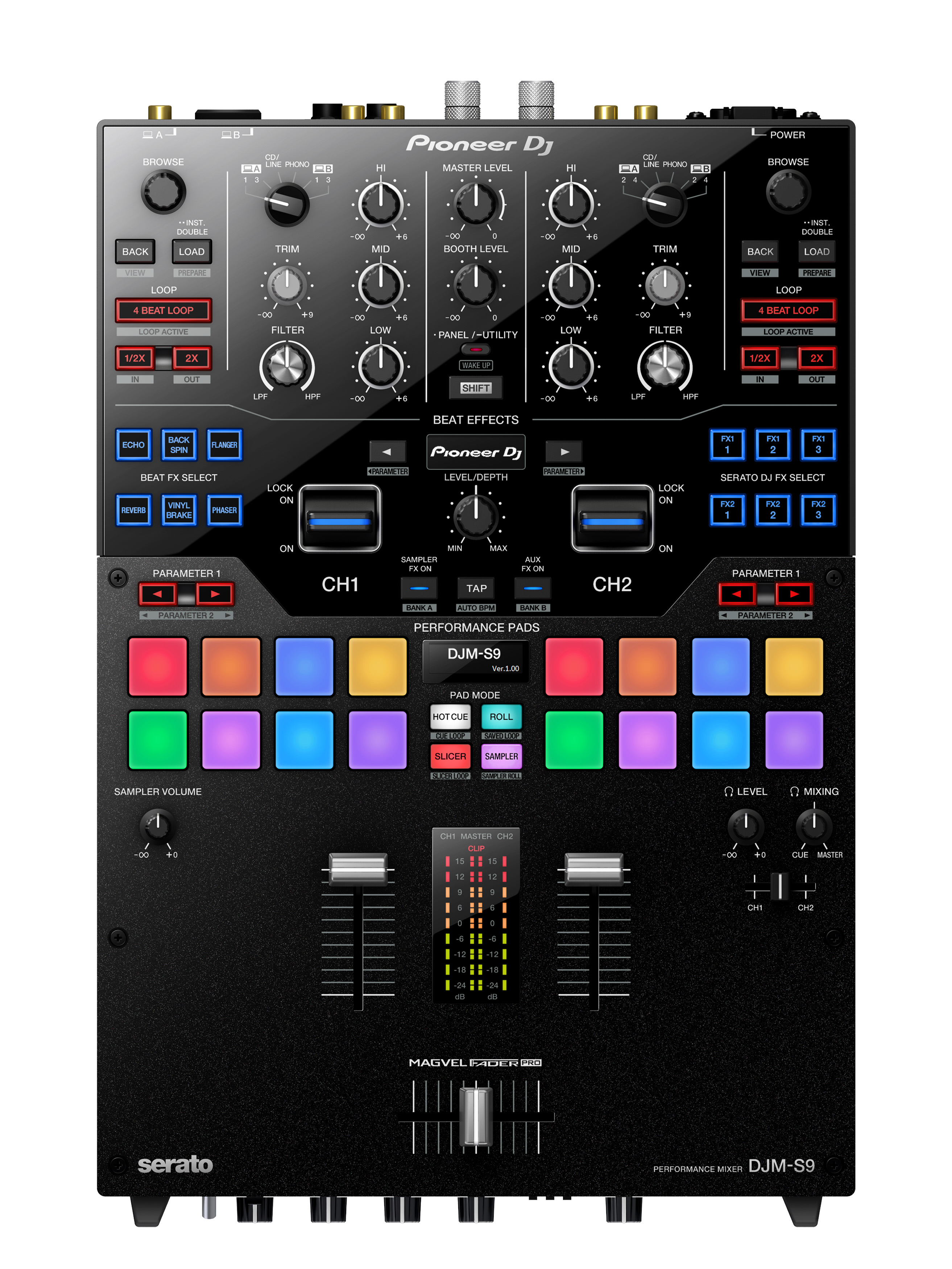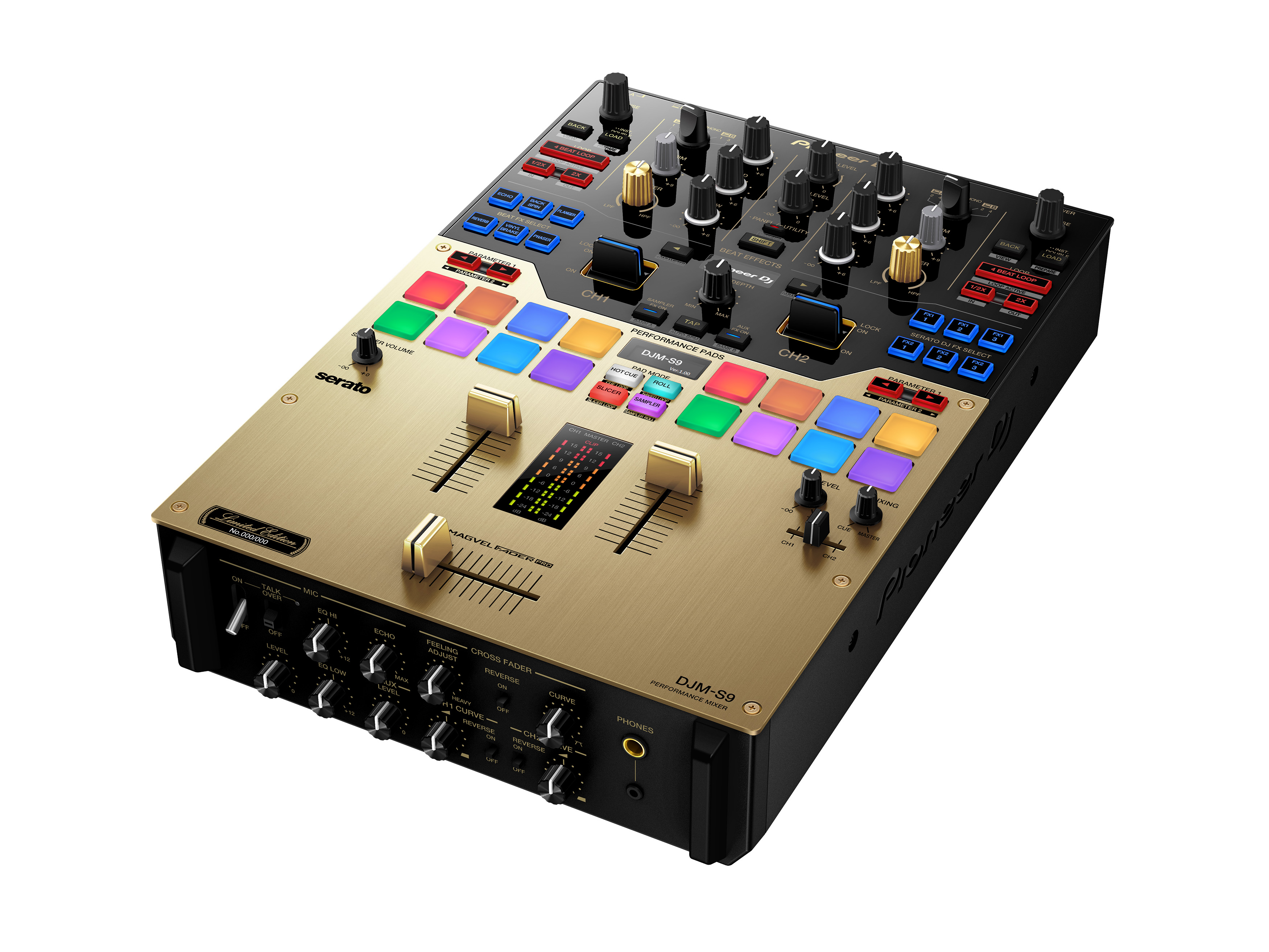 La Pioneer DJM-S9 tiene Performance Pads grandes con ingeniería de precisión para una respuesta rápida y eficiente. Los DJs pueden utilizar los dieciséis pads multicolores (ocho en cada deck) para activar y manipular funciones como Hot Cue, Roll, Slicer y Loop. O pueden optar por asignar los pads a otras funciones del Serato DJ. La pantalla orgánica “E.L.” muestra lo que está activo y los DJs pueden asignar colores a los pads para Hot Cues en Serato DJ para tener un referente visual más potente.