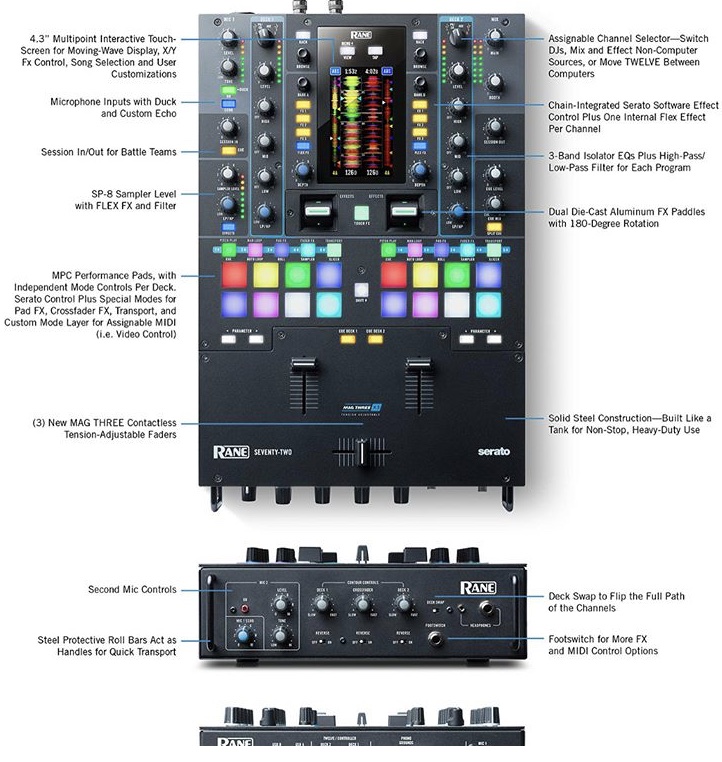 Sobre el mixer Rane Seventy-Two ya hemos hablado en otro post. Lo primero que llama la atención es su parecido con la DJM-S9 de Pioneer, yo personalmente no critico dicho diseño ya que la S9 es un mixer de batalla sublime en lo que se refiere a la disposición de los hot cues, faders y knoobs. La pantalla táctil le da un atractivo extra, aunque supongo que eso le dará otro “extra” en el precio final.