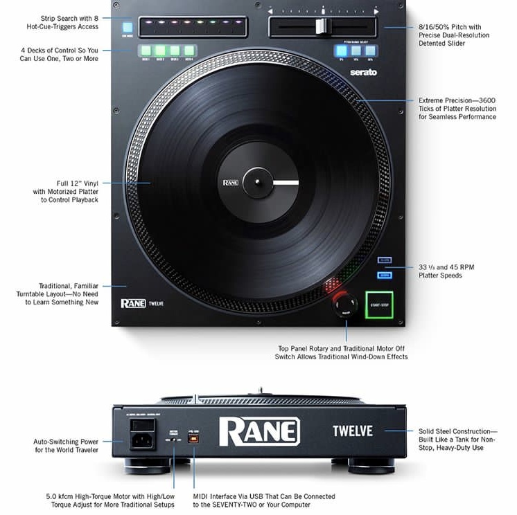 Después de algunas filtraciones y muchos rumores se confirma lo que muchos esperaban, Rane lanza al mercado el Twelve (motorized battle controller) un sistema de control que emula el tacto de un tocadiscos pero sin aguja ni brazo. Junto con la Rarne Seventy-Two, su nuevo mixer de batalla con pantalla táctil.