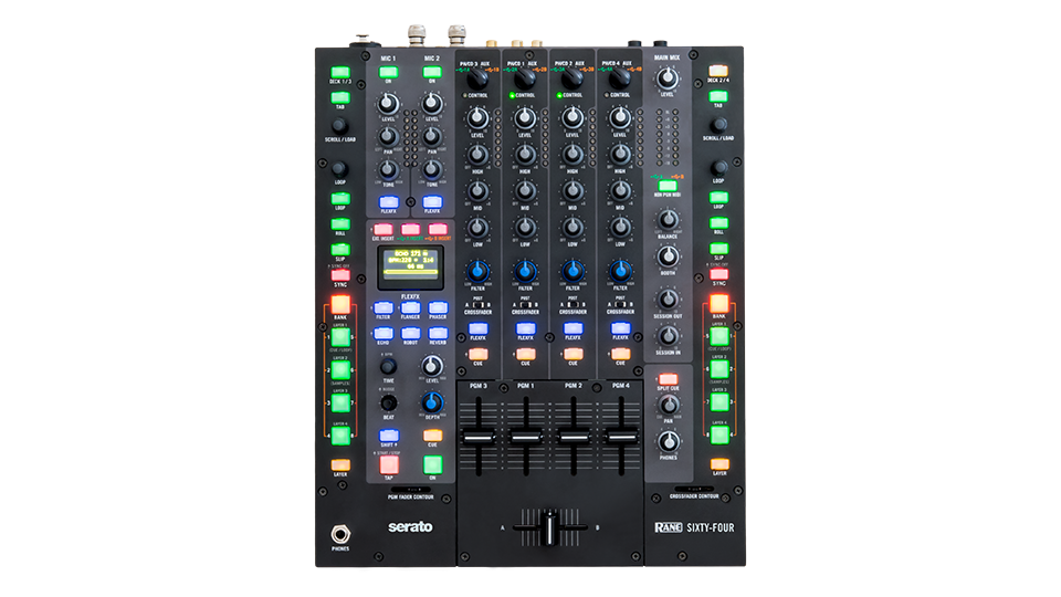 El Sixty-Four es un mixer de club con cuatro canales que viene con dos puertos USB, lo que permite realizar el siempre problemático cambio de DJ sin complicaciones y con suma sencillez. Viene con una serie de efectos incorporados y soporta Serato NoiseMap Vinyl/CD control en Serato DJ.