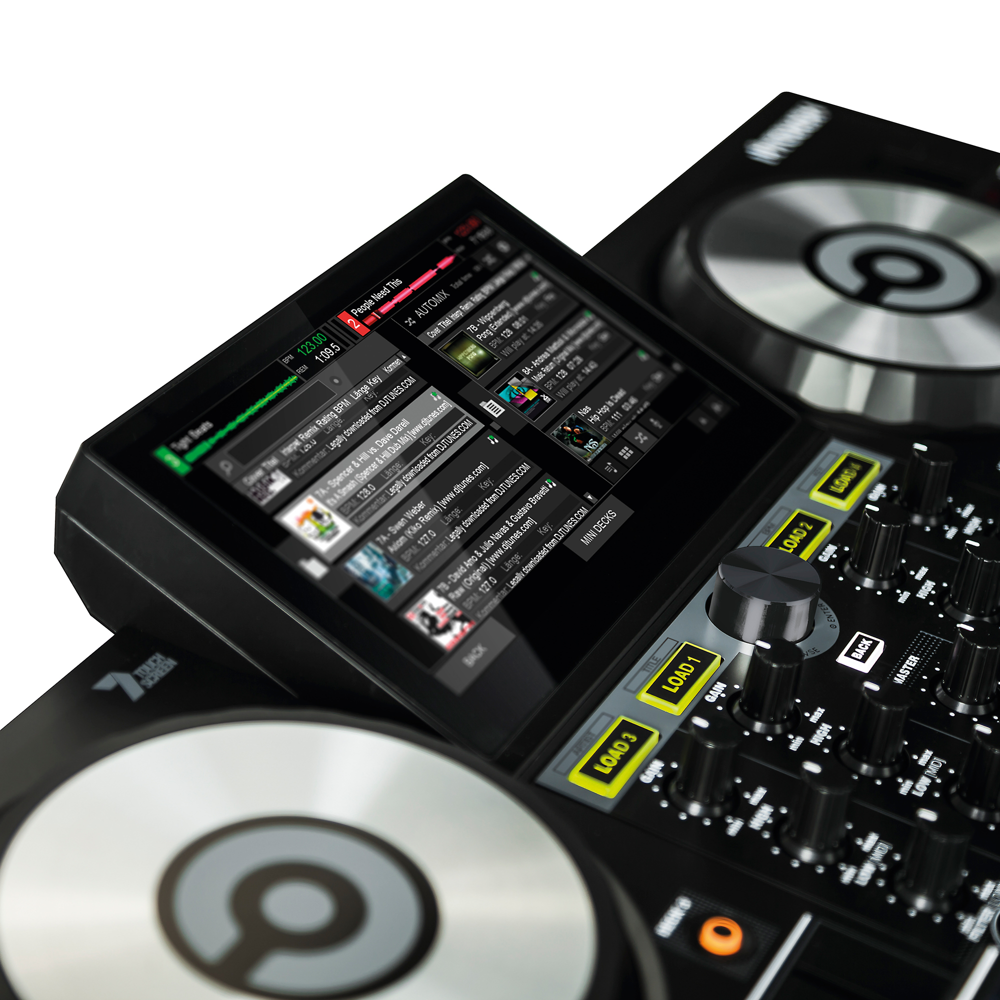 – Según el fabricante, primer controlador de DJ del mundo con pantalla táctil de 7 pulgadas a todo color con lo cual puedes pinchar sin la necesidad de mirar tu ordenador