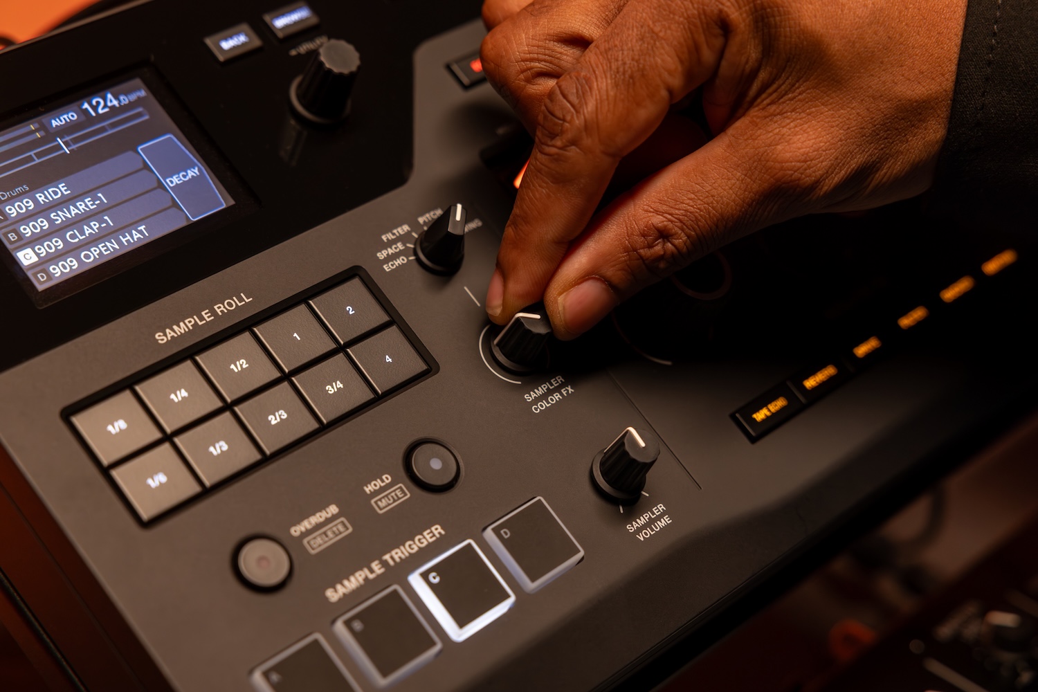 La sección del sampler cuenta con 6 efectos dedicados (Echo, Space, Filter, Pitch, Decay, Swing), que se pueden controlar con un solo mando. Estos efectos te permiten transformar instantáneamente tus samples, añadiendo profundidad, tensión o swing. Y como estos efectos son independientes de la sección 3-Band FX, puedes procesar los samples por separado, ampliando aún más las posibilidades creativas.