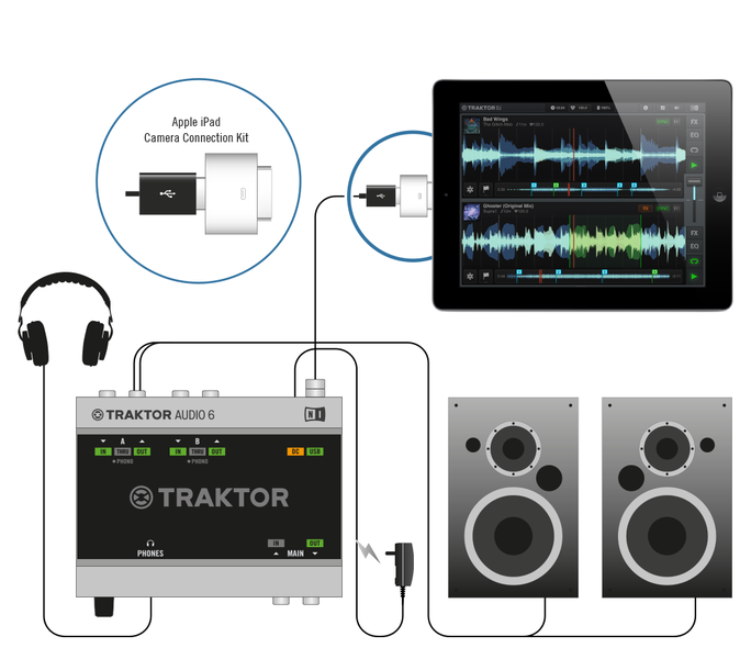 Como complemento de la gama existente de productos de Traktor, Traktor DJ sincronica bidireccionalmente la configuración y las propiedades de cada track con el Traktor Pro 2. Esto le proporciona a los DJs un flujo de trabajo ideal para planificar una sesión mientras llegas al sitio donde tienen que pinchar. Los usuarios también pueden transferir toda su obra almacenada en Traktor Pro directamente a Traktor DJ, esto incluye los beat grid, los puntos cue, los loops y el BPM. Todo ello puede sincronizarse a través de una cuenta gratuita en Dropbox. Los DJs pueden conectar su iPad a los interfaces de audio Traktor Audio 6 y 10, usando para ello el Apple Camera Connection Kit, así disfrutarán de una calidad óptima de audio y la posibilidad de pre-escuchar sus tracks (también es posible utilizar un cable divisor de señal dedicado). Traktor DJ también proporciona una manera fácil para que los DJs graben sus mezclas en el iPad en alta calidad.